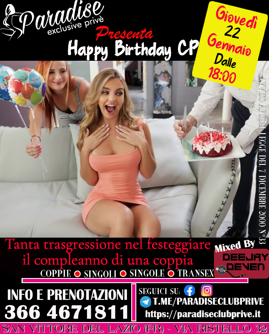 Una notte dedicata come sempre alla trasgressione in ogni sua forma… una notte dedicata a una coppia per festeggiare tutti insieme in suo compleanno, per tutti una gustosissima cena, tanta musica e divertimento…