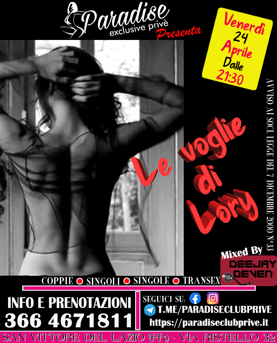 Una serata con tante sorprese e trasgressione, con aperitivo in compagnia di donne che amano divertirsi in giochi di gruppo con singoli e singole educate che amano trasgredire anche in gruppo, e per rendere i vostri attimi sempre più trasgressivi ci terrà compagnia Lory che vi farà trascorrere momenti unici…