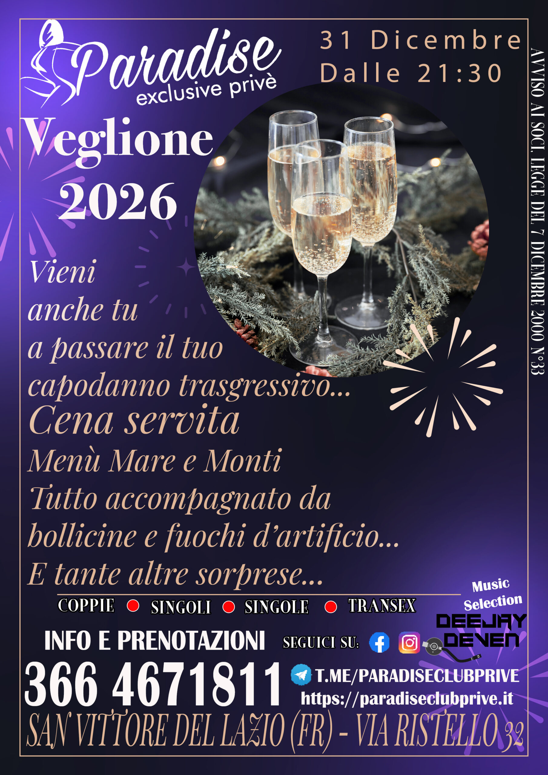 Una serata particolare per festeggiare tutti insieme l’arrivo del nuovo anno, facendolo come sempre come piace a tutti i soci del paradise… In modo elegante ma trasgressivo.